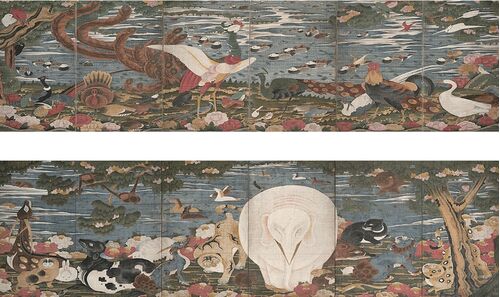 *樹下鳥獣図屏風* 作 者 伊藤若冲 時 代 江戸時代中期 年 代 18世紀 居住地 江戸 分 類 奇想の絵師 特 徴 他に例のない技法、鮮やかな色彩 技 法 枡目描き 題 材 動物・鳥 その他 137.5×355.6cm 樹下鳥獣図屏風は、江戸時代中期の画家・伊藤若冲が描いたと…